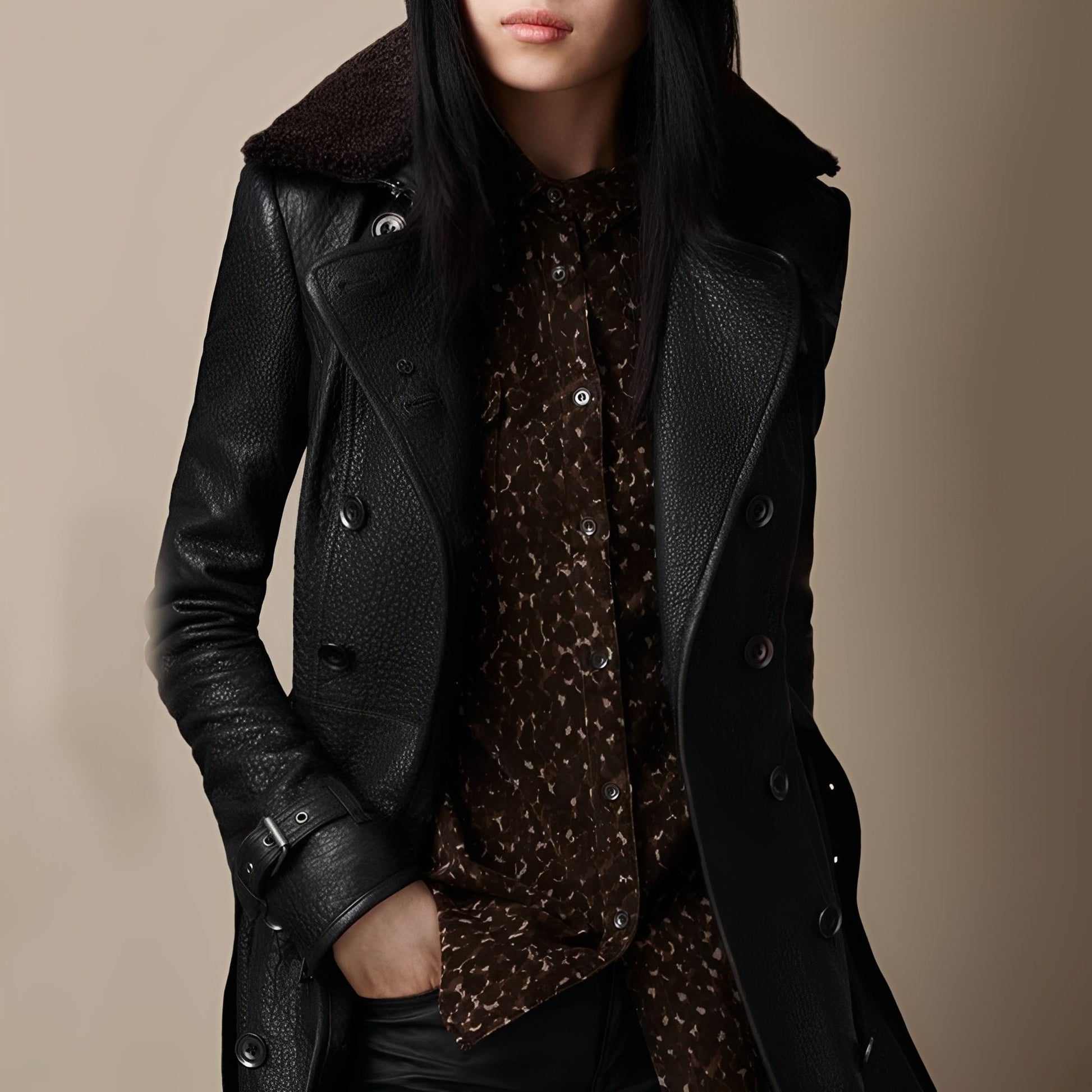 Denne luksuriøse Sylvaine læderfrakke til kvinder kombinerer klassisk elegance med moderne design. Fremstillet af førsteklasses læder, tilbyder den en blød og smidig fornemmelse, samtidig med at den bevarer en struktureret og flatterende silhuet. Dens tidløse snit og raffinerede detaljer gør den perfekt til både professionelle outfits og elegante aftenudflugter. Dens alsidige design gør det nemt at kombinere den med kjoler, nederdele eller bukser. Et must-have i garderoben for kvinder, der ønsker at forblive stilfulde og selvsikre i enhver sæson.